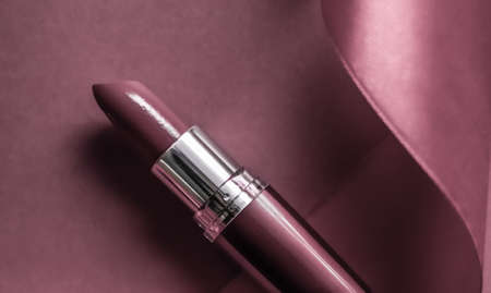 Cosmetic branding, glamour lip gloss and shopping sale concept - Luxury lipstick and silk ribbon on purple holiday background, make-up and cosmetics flatlay for beauty brand product design
