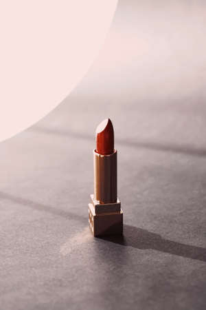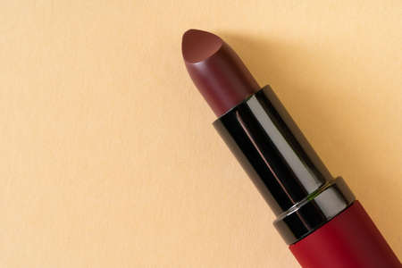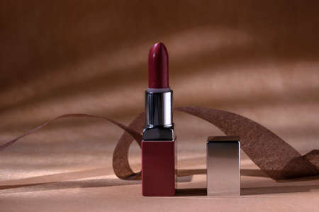 Burgundy lipstick. Lipstick on a brown background, rays of light behind the composition. Cosmetics on a brown background.