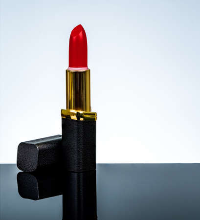Red modern moisturizing lipstick in a black base on a light background.