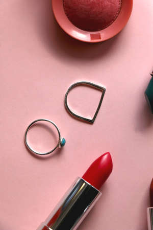 Various lipsticks, pink blush and silver rings on bright pink background. Flat lay.