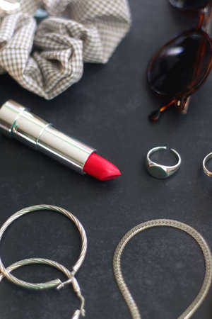 Lipstick, blush, decorative hair clips, scrunchie, sunglasses and various silver jewelry on dark gray background. Selective focus.