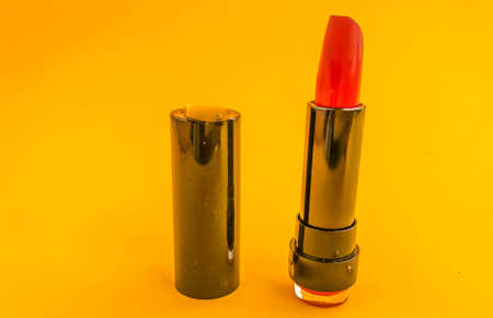 Beautiful fashionable beauty cosmetic glamorous red lipstick for applying makeup on the lips on a yellow gentle background.
