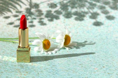 Red lipstick with chamomile flowers on light background of nature with fern leaves. Decorative beauty cosmetic product for woman with place for text