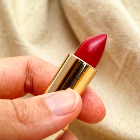 Open red lipstick in woman hand.
