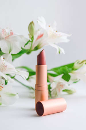 close-up of lipstick in nude color in a golden case against a background of white alstroemerias