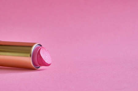 An old used tube of lipstick lies on a pink background