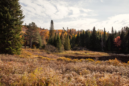 Beautiful autumn forest with a river and a blue sky with white clouds. Algonquin Park, Canada.