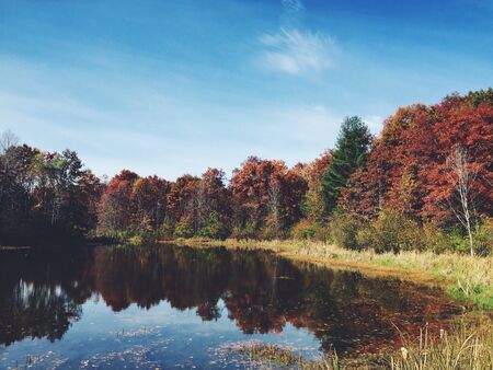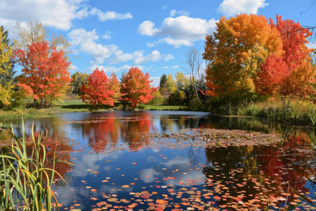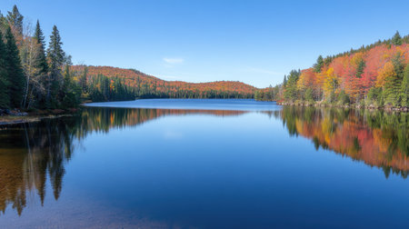 Autumn foliage reflected in the calm waters of the lake, nature background