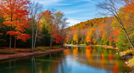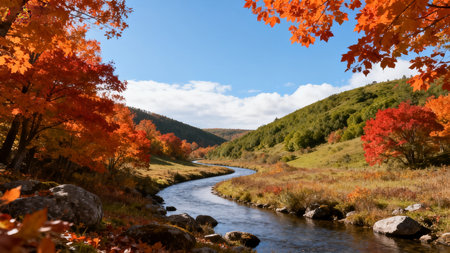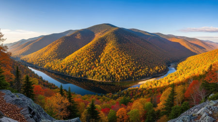Winding river reflecting vibrant autumn colors of the dense forest valley. scenic landscape with colorful fall foliage on rolling hills under a clear sky.