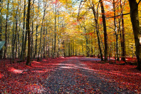 Road in the autumn forest with colorful trees in the fall season.