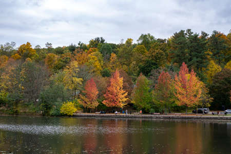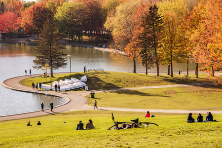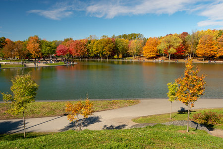 Montreal, Canada - 14 October 2018: Beaver lake at the top of Mont-Royal, as foliage bursts with autumn colors.