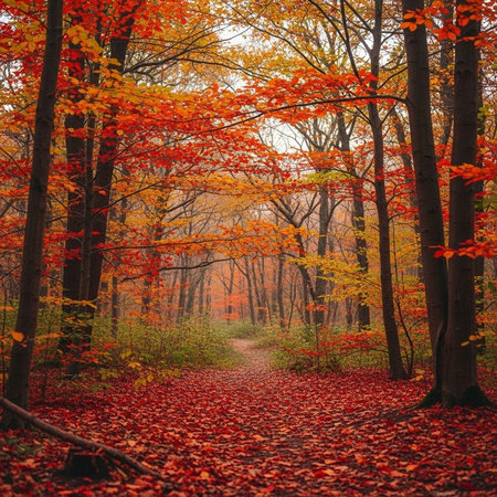 Path in a forest with colorful autumn leaves and trees