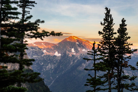 A scenic sunrise captures mountain peaks and colorful clouds along the Highline Trail in Glacier National Park