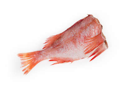 Raw headless gutted carcass of redfish also known as ocean perch or Norway haddock on a white background