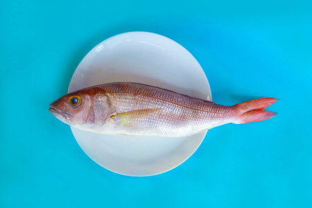 Fresh fish on a white plate on a blue background, top view