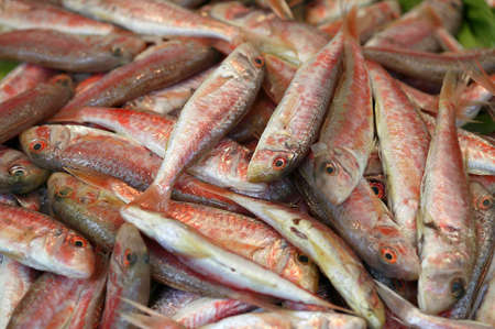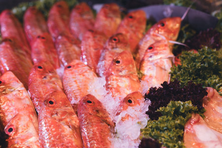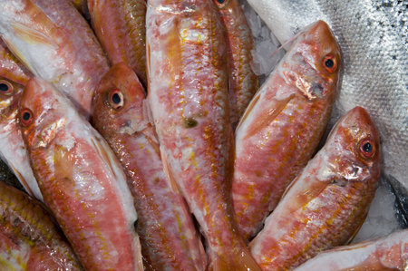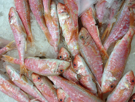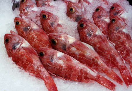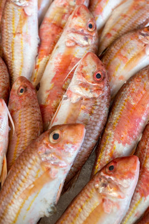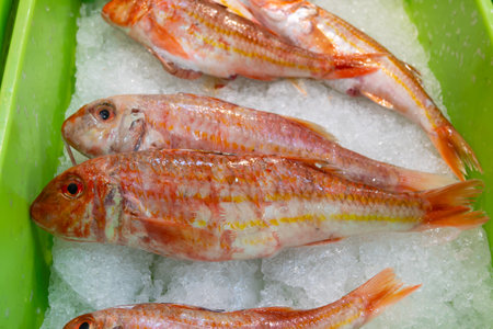 Red striped mullet on ice at the seafood market.Mediterranean fish and it is also the best ingredient of the diet.
