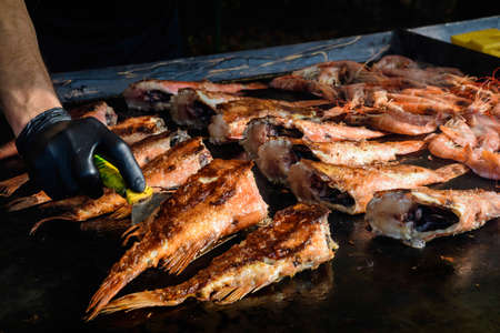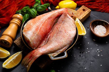 Raw Rose fish also known as ocean perch, Atlantic golden redfish, bream or hemdurgan ready to be grilled on a black metallic surface, ready to eat seafood
