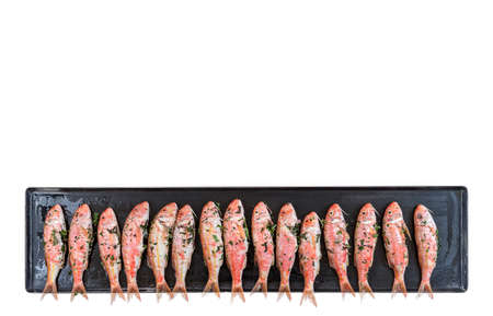 Plenty of red mullet fish ready to cook on a long plancha at on white