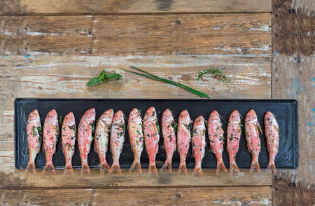 Plenty of red mullet fish ready to grill at barbecue on old wooden booard