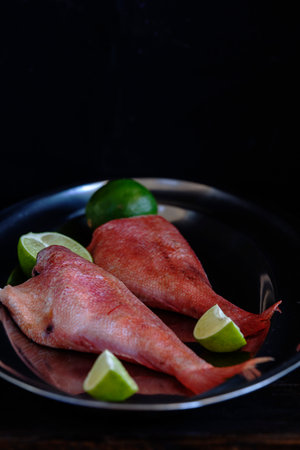 Fresh red mullet fish with lime on black plate over black background