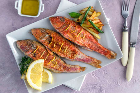 Fried Red Mullet or Turkish Barbunya on Plate, top view.