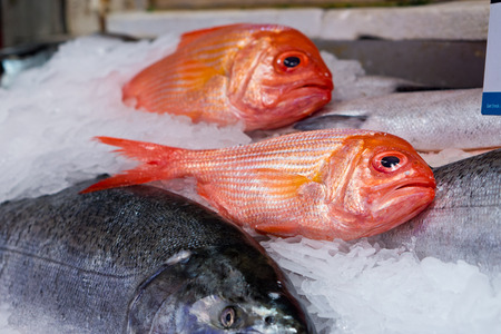Red fish on a fish counter of a shop in Madrid
