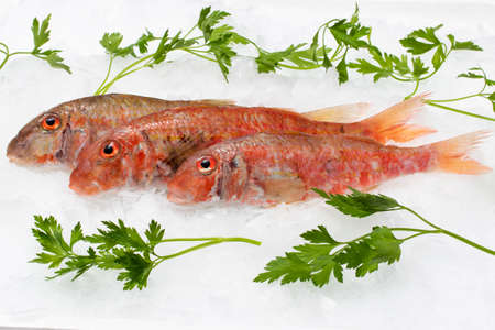 Close up side view of fresh red mullets on crushed ice with decorative green parsley leaves.