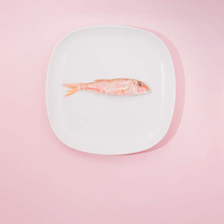 Fish on plate on pink background. Creative minimal flat lay.