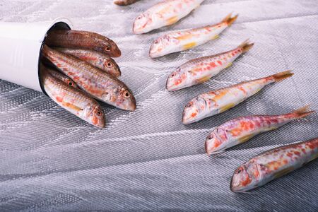 Red mullet (Mullus surmuletus) freshly caught rock mullet, raw in old tray and fisherman's handkerchief on blue wooden table. Top view.