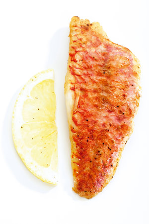 Fresh gurnard fillet with lemon on white plate.