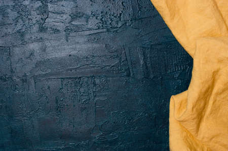 Navy blue kitchen background with yellow napkin, copy space