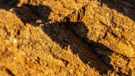 An extreme close-up reveals the intricate texture of a rough, golden-brown rock. Sunlight catches the surface, highlighting its weathered contours and granular composition. Small, glistening water droplets are scattered across the rock, adding a sense of freshness and detail. The warm, earthy tones and the play of light and shadow create a visually rich and abstract pattern, showcasing the natural beauty and geological history of the stone.