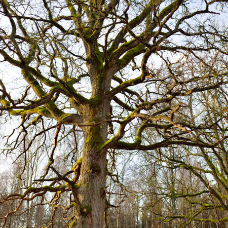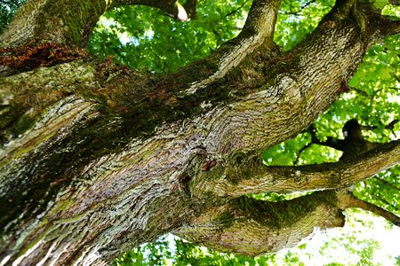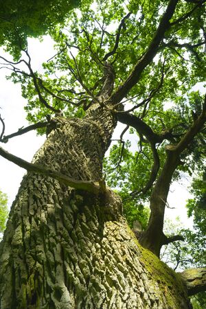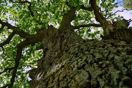 Bottom-up view of a powerful trunk and branches of an old oak tree