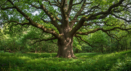 A majestic oak tree stands proudly with its sprawling branches, illuminated by soft sunlight filtering through lush leaves, creating a serene atmosphere.