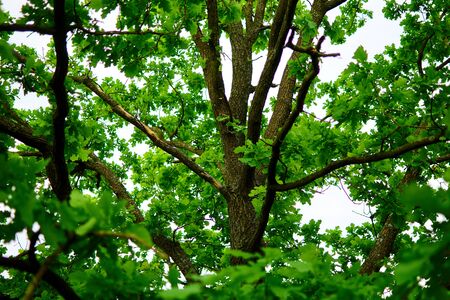 Leaves and branches of an old oak. View from below of a large old oak tree in the woods.