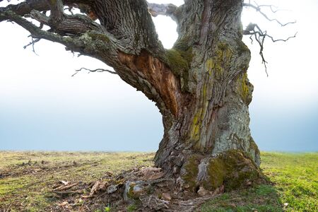 broken trunk of eight hundred years old, historic oak on a meadow in Poland