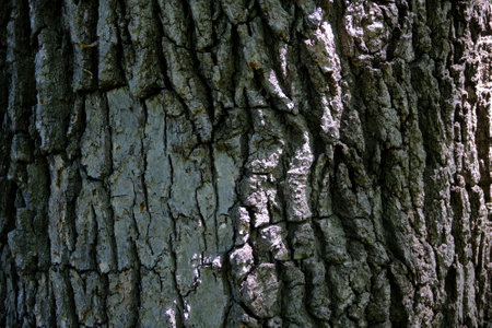 The bark of the old tree. The relief bark of a large tree. Cold shades. Deep vertical cracks. Solar lighting. Day, park