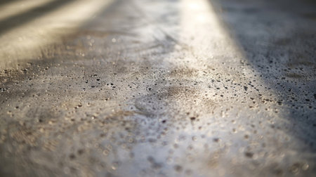 High-detail macro image of a wet cement surface, showcasing natural texture and depth. Sunlight reflections and motion blur add dynamic realism to the scene.
