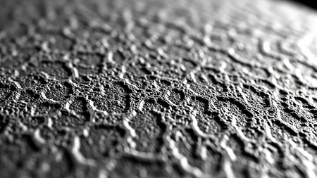 Patterns showing extreme close-up black and white abstract texture of a rough, bumpy, and uneven surface with intricate patterns and deep shadows creating a...