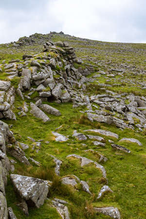 Looking up to Great Staple Tor from Roos Tor under dark cloudy sky, Dartmoor National Park, Devon, UK