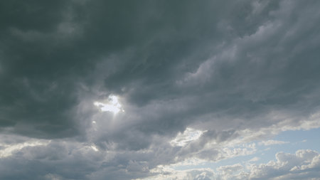 Dramatic cloudscape. Sunny light through dark heavy thunderstorm clouds before rain. Overcast rainy bad weather. Storm warning. Natural blue background of cumulonimbus. Sunlight in stormy cloudy sky.