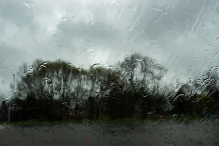 Drops of water dripping from the windshield in the rain. The blurred outlines of trees outside the window. Photo taken from inside the vehicle. Made in low light conditions