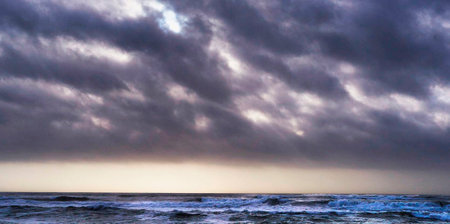 Dark storm sky above the Baltic sea, waves and water splashes. Dramatic cloudscape. Nature, environment, fickle weather, climate change. Atmospheric scenery. Panoramic view, long exposure