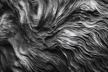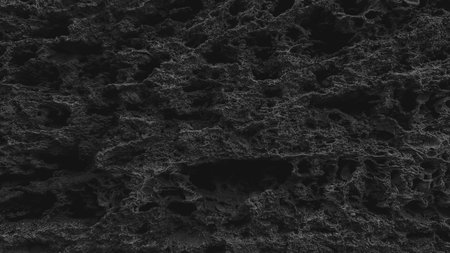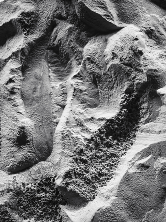 Patterns showing extreme close-up black and white abstract texture of a rough, bumpy, and uneven surface with intricate patterns and deep shadows creating a...