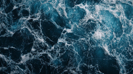 Deep blue ocean water with swirling waves and splashes. Top view of vibrant seascape with sea water