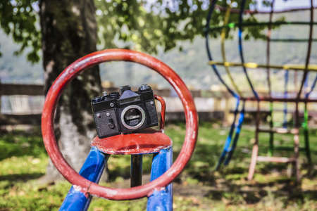 Side view of a roll of photographic camera film in canister, resting a wooden table. Copy space left frame.