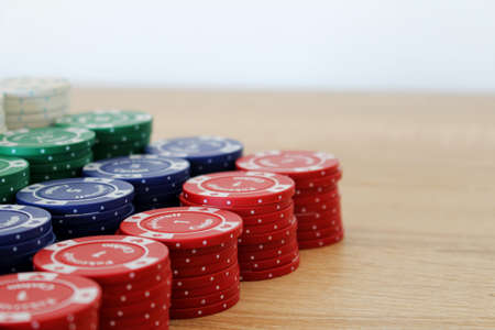 Poker chips over old wooden table. Group of different poker chips. Casino background.