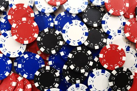 Colorful casino chips background. Many colored chips backdrop. Lot multicolor assorted gambling playing chips surface.