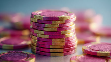 Bright pink and glaming gold tokens are precisely stacked on a mirror-like surface, with scattered colorful chips softly fading into the background, evoking themes