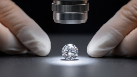 A close-up view of a brilliant cut diamond being inspected under a magnifying glass. Gloved hands carefully handle the gem, highlighting its dazzling beauty.